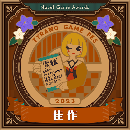 プレイさせていただいたどのゲームもそれぞれの魅力があり、大変迷ったのですが…… やはり物語の主軸である『ストーリー』が面白いというのは 時間がどれだけ経ったとしても変わらぬ魅力があると思いましたので、 ストーリーが大変秀逸に感じられましたこちらの作品を選ばせていただきました。 それぞれの人物にそれぞれの動機・考え方があり、それらが複雑に絡み合って起きる事象と それを人物視点でどう切り取るかも含めて、大変よく計算されており面白かったです。 ここまでの作品を作るのはそれはもう大変だったかと思いますが、生み出してくださったことへのお礼と これからもこんな作品が増えてほしいという思いとともに、勝手ながら賞とさせていただきます。 素敵なゲームをありがとうございました…!
